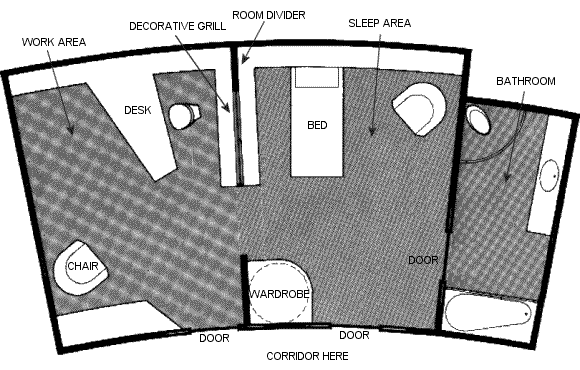 Keeping with Starfleet tradition, Deck 5 houses the senior officers' quarters. These staterooms are quite similar to the V.I.P. units on Deck 4, with only a few differences. The sleeping area holds a single large bed.
